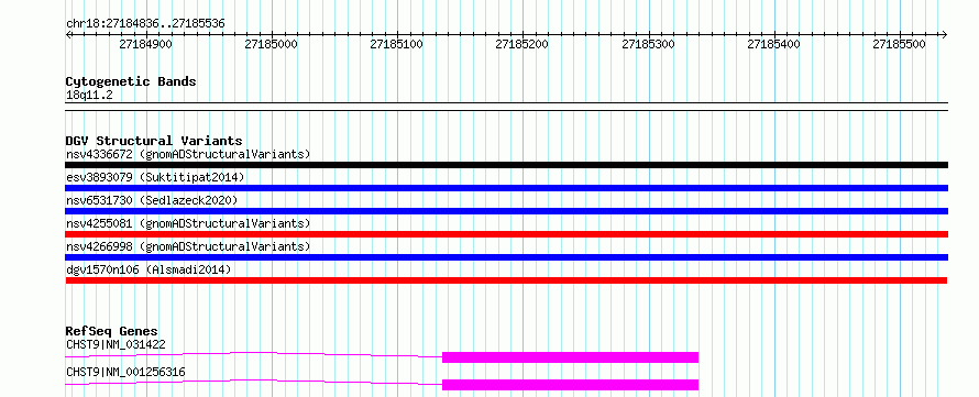 | | Variant Type | CNV deletion | | Copy Number | | | Allele State | | | Allele Origin | | | Probe Count | | | Validation Flag | | | Merged Status | M | | Merged Variants | | | Supporting Variants | nsv1121948, nsv1126479 | | Samples | KWS2, KWS1 | | Known Genes | CHST9 | | Method | Sequencing | | Analysis | HugeSeq | | Platform | Illumina HiSeq 2000 | | Comments | | | Reference | Alsmadi_et_al_2014 | | Pubmed ID | 24896259 | | Accession Number(s) | dgv1570n106