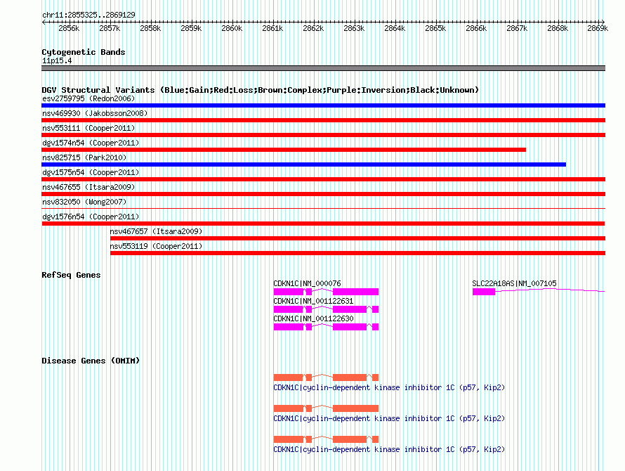 | Variant Type | CNV loss | Copy Number | | Allele State | | Allele Origin | | Probe Count | | Validation Flag | | Merged Status | M | Merged Variants | | Supporting Variants | nsv553118, nsv553117 | Samples | | Known Genes | CDKN1C, SLC22A18AS | Method | SNP array | Analysis | Illumina SNP array copy number analysis | Platform | Not reported | Comments | | Reference | Cooper_et_al_2011 | Pubmed ID | 21841781 | Accession Number(s) | dgv1576n54