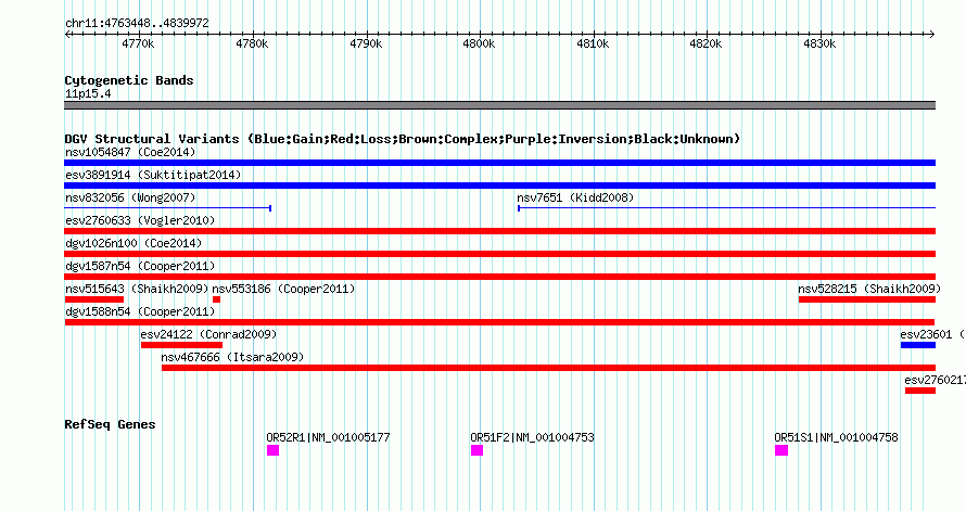 Variant DetailsVariant: dgv1588n54| Internal ID | 22769483 | | Landmark | | | Location Information | | | Cytoband | 11p15.4 | | Allele length | | Assembly | Allele length | | hg38 | 76525 | | hg19 | 76525 | | hg18 | 76525 |