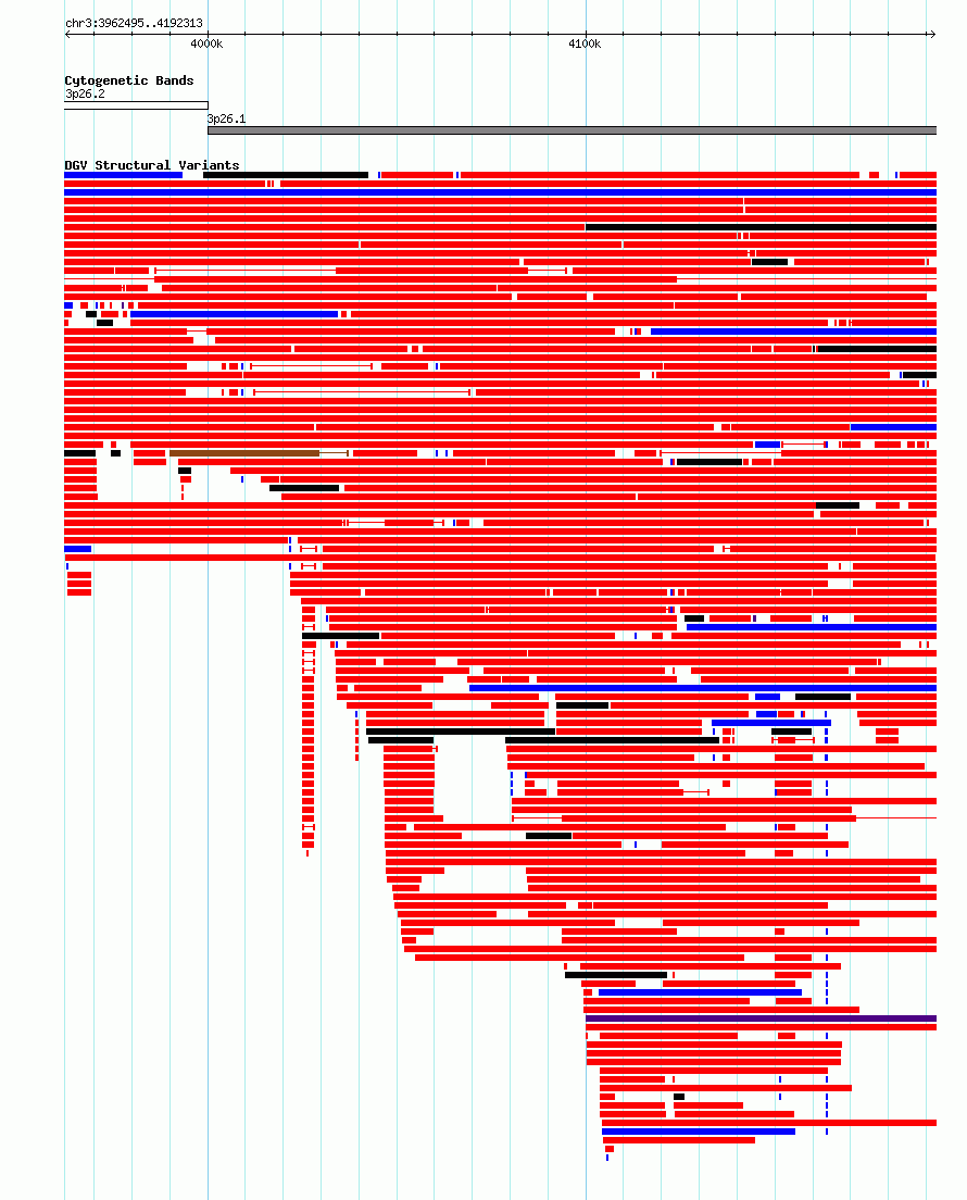 Variant DetailsVariant: dgv1591n166 | Internal ID | 22801490 | | Landmark | | | Location Information | | | Cytoband | 3p26.1 | | Allele length | | Assembly | Allele length | | hg38 | 229819 | | hg19 | 229819 |