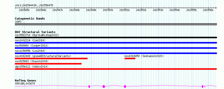 Variant DetailsVariant: dgv159e212 | Internal ID | 22783086 | | Landmark | | | Location Information | | | Cytoband | 1q43 | | Allele length | | Assembly | Allele length | | hg38 | 12040 | | hg19 | 12040 |