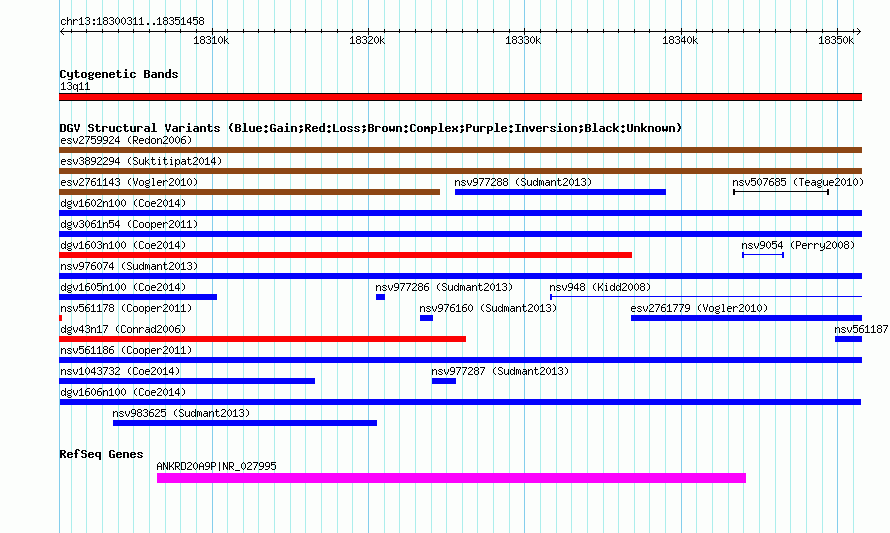 Variant DetailsVariant: dgv1606n100| Internal ID | 22787693 | | Landmark | | | Location Information | | | Cytoband | 13q11 | | Allele length | | Assembly | Allele length | | hg38 | 51148 | | hg19 | 51148 | | hg18 | 51148 |