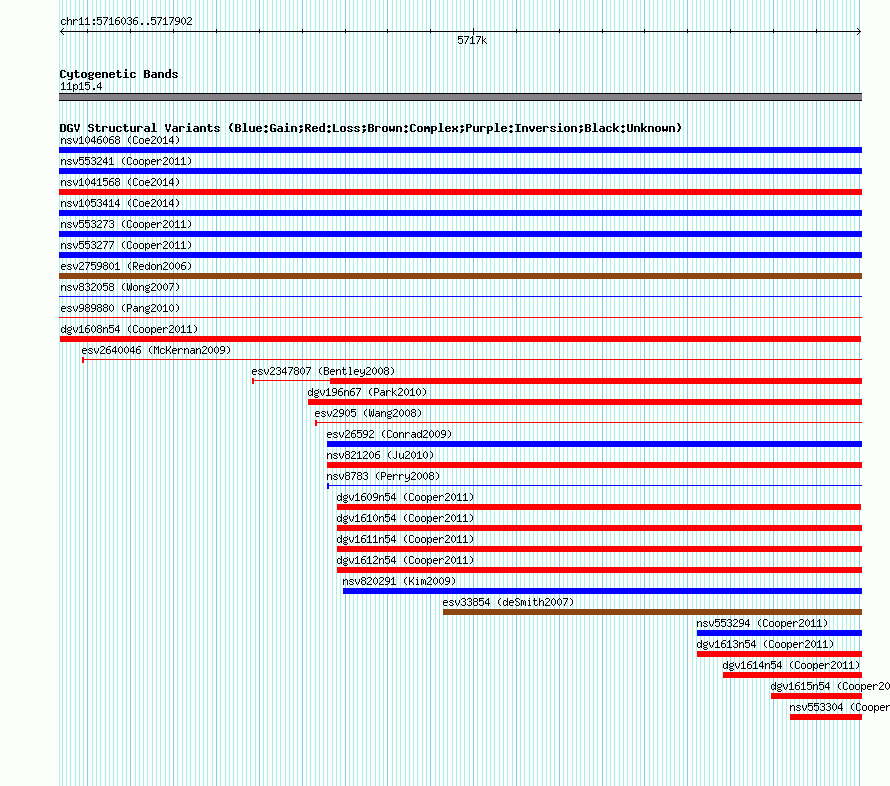 Variant DetailsVariant: dgv1608n54| Internal ID | 22769503 | | Landmark | | | Location Information | | | Cytoband | 11p15.4 | | Allele length | | Assembly | Allele length | | hg38 | 1867 | | hg19 | 1867 | | hg18 | 1867 |