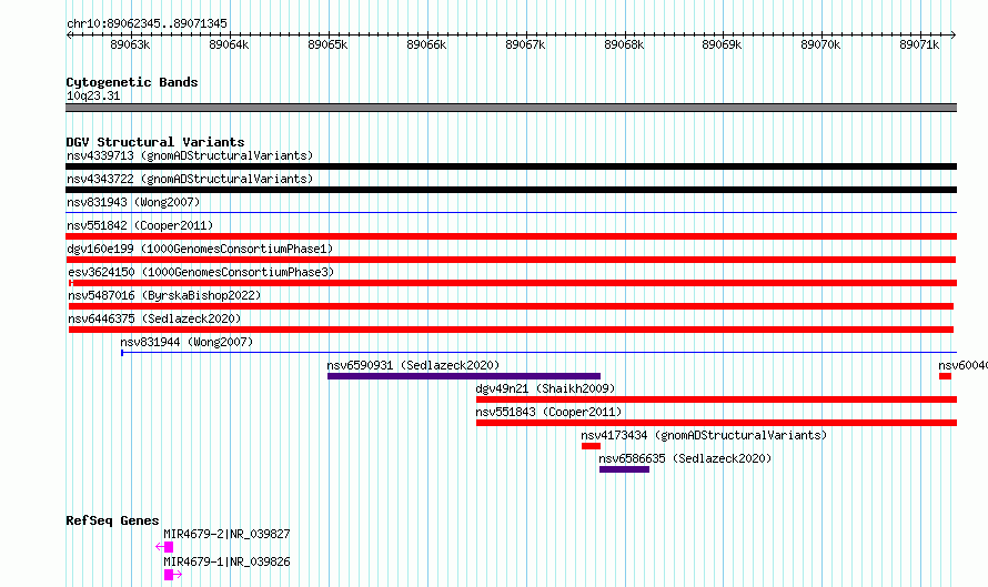 Variant DetailsVariant: dgv160e199| Internal ID | 22757933 | | Landmark | | | Location Information | | | Cytoband | 10q23.31 | | Allele length | | Assembly | Allele length | | hg38 | 9001 | | hg19 | 9001 |