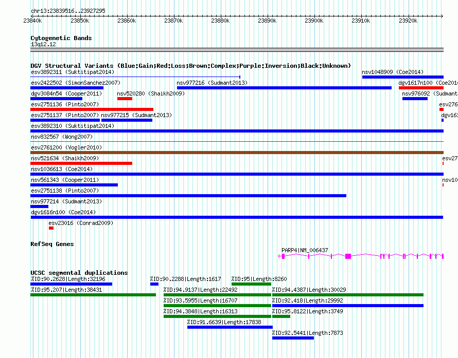 Variant DetailsVariant: dgv1616n100| Internal ID | 20153232 | | Landmark | | | Location Information | | | Cytoband | 13q12.12 | | Allele length | | Assembly | Allele length | | hg38 | 87780 | | hg19 | 87780 | | hg18 | 87780 |