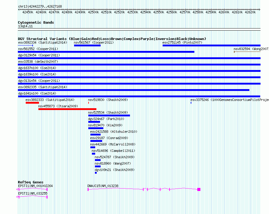 Variant DetailsVariant: dgv1641n100| Internal ID | 20153257 | | Landmark | | | Location Information | | | Cytoband | 13q14.11 | | Allele length | | Assembly | Allele length | | hg38 | 184890 | | hg19 | 184890 | | hg18 | 184890 |