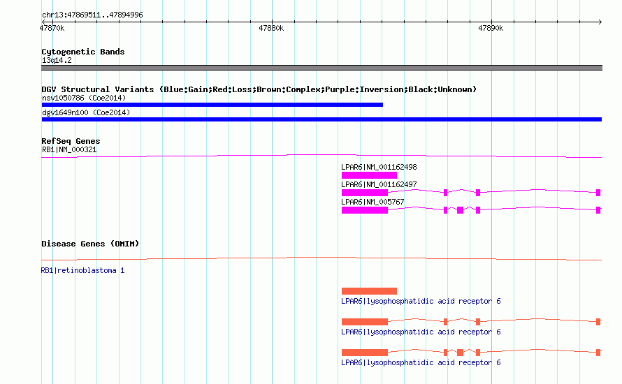 | | Variant Type | CNV gain | | Copy Number | | | Allele State | | | Allele Origin | | | Probe Count | | | Validation Flag | | | Merged Status | M | | Merged Variants | | | Supporting Variants | nsv1043486, nsv1053432 | | Samples | | | Known Genes | LPAR6, RB1 | | Method | SNP array | | Analysis | Affymetrix SNP array copy number analysis | | Platform | Affymetrix SNP Array 6.0 | | Comments | | | Reference | Coe_et_al_2014 | | Pubmed ID | 25217958 | | Accession Number(s) | dgv1649n100