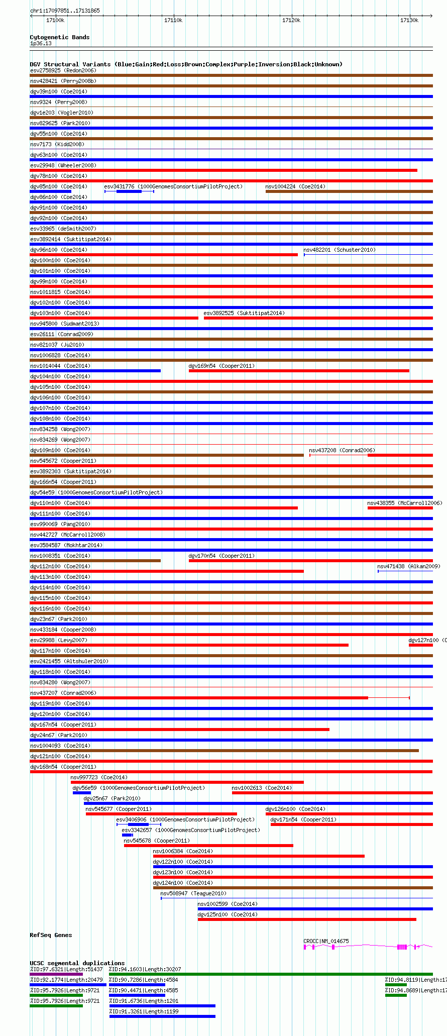 Variant DetailsVariant: dgv168n54| Internal ID | 20133592 | | Landmark | | | Location Information | | | Cytoband | 1p36.13 | | Allele length | | Assembly | Allele length | | hg38 | 34015 | | hg19 | 34015 | | hg18 | 34015 |