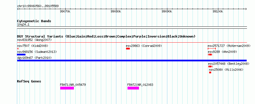 | Variant Type | CNV gain | Copy Number | | Allele State | | Allele Origin | | Probe Count | | Validation Flag | | Merged Status | M | Merged Variants | | Supporting Variants | nsv825534, nsv825533 | Samples | NA18969, NA18973 | Known Genes | FRAT1, FRAT2 | Method | Oligo aCGH | Analysis | To select parameters for calling CNVs (that is, the statistical threshold of the ADM2 algorithm, the minimum +/- log2 ratio and the minimum number of consecutive probes in a CNV interval), we calculated the sensitivity and positive predictive value based on the comparison of aCGH-based CNV calls (using our high-resolution Agilent 24M platform) with read-depth sequence data for two samples from Korean individuals (AK1 and AK2). We attempted to obtain `absolute' copy number status of the sample from NA10851, which was used as the reference sample for aCGH experiments in this study. For this, we used read-depth data for NA10851 obtained from massively parallel sequencing by the Illumina GA II data. The read-depth data represent the copy number status of NA10851 as compared to the human reference genome (hg18) because the short read sequences were aligned to hg18. | Platform | Agilent 24M aCGH | Comments | | Reference | Park_et_al_2010 | Pubmed ID | 20364138 | Accession Number(s) | dgv169n67