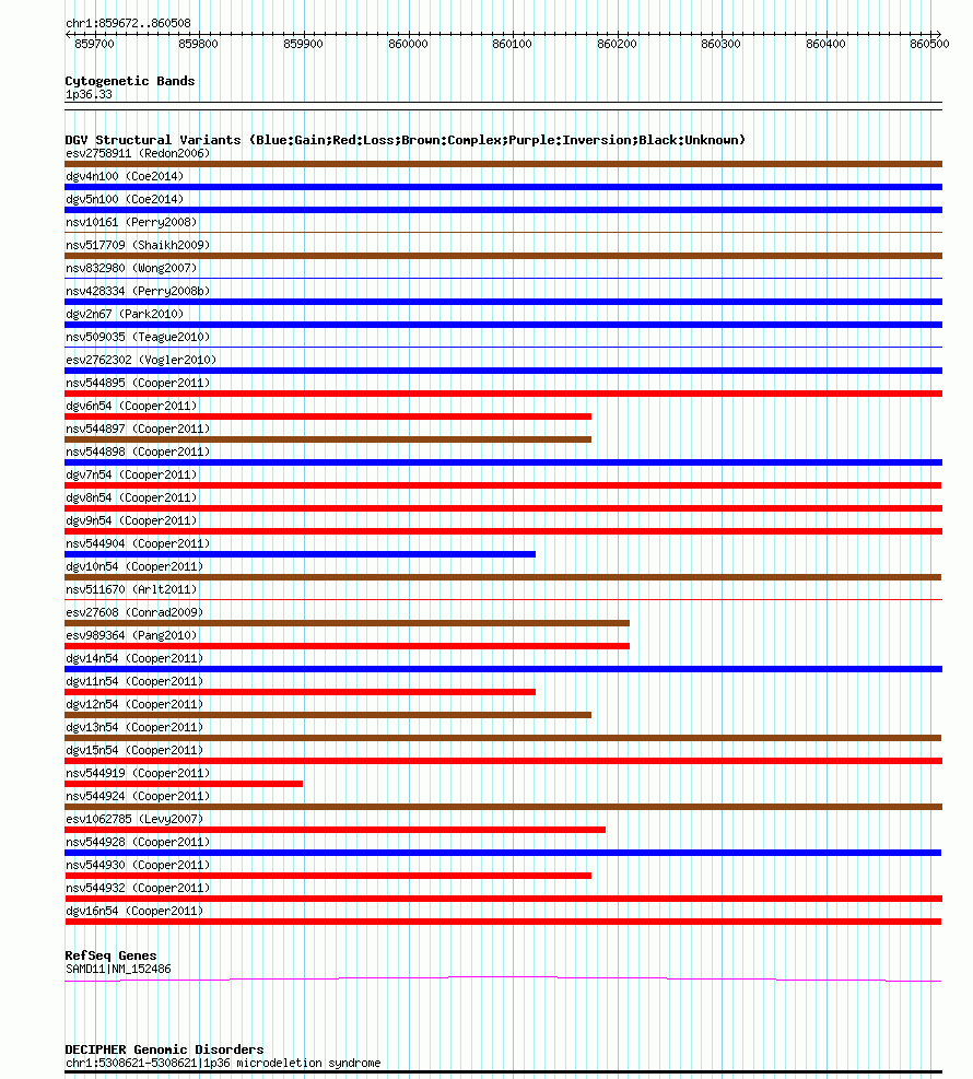 | Variant Type | CNV loss | Copy Number | | Allele State | | Allele Origin | | Probe Count | | Validation Flag | | Merged Status | M | Merged Variants | | Supporting Variants | nsv544931, nsv544934 | Samples | | Known Genes | SAMD11 | Method | SNP array | Analysis | Illumina SNP array copy number analysis | Platform | Not reported | Comments | | Reference | Cooper_et_al_2011 | Pubmed ID | 21841781 | Accession Number(s) | dgv16n54