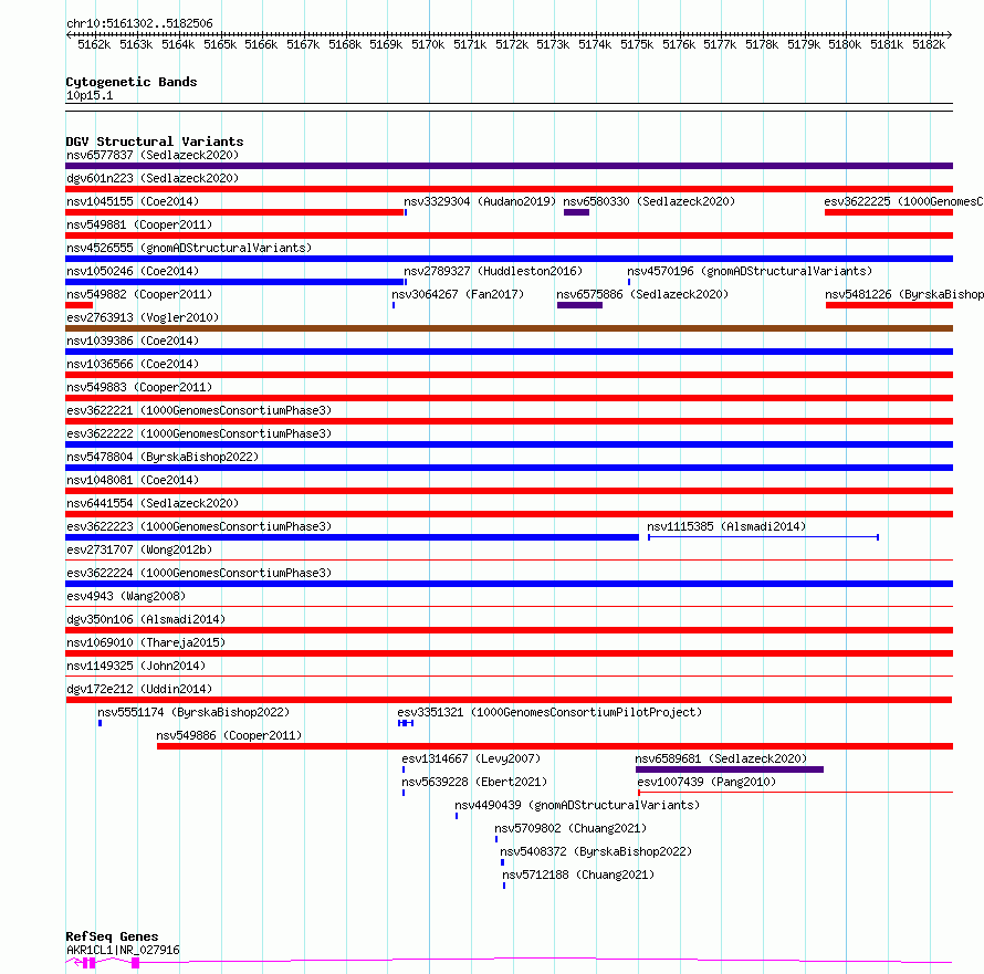 Variant DetailsVariant: dgv172e212| Internal ID | 22783099 | | Landmark | | | Location Information | | | Cytoband | 10p15.1 | | Allele length | | Assembly | Allele length | | hg38 | 21205 | | hg19 | 21205 |