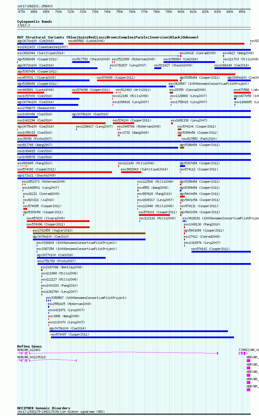 Variant DetailsVariant: dgv172n21| Internal ID | 22766364 | | Landmark | | | Location Information | | | Cytoband | 17p13.3 | | Allele length | | Assembly | Allele length | | hg38 | 190202 | | hg19 | 190202 | | hg18 | 190202 | | hg17 | 190202 |