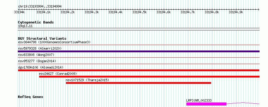 Variant DetailsVariant: dgv1769n106| Internal ID | 22795597 | | Landmark | | | Location Information | | | Cytoband | 19q13.11 | | Allele length | | Assembly | Allele length | | hg38 | 1001 | | hg19 | 1001 |