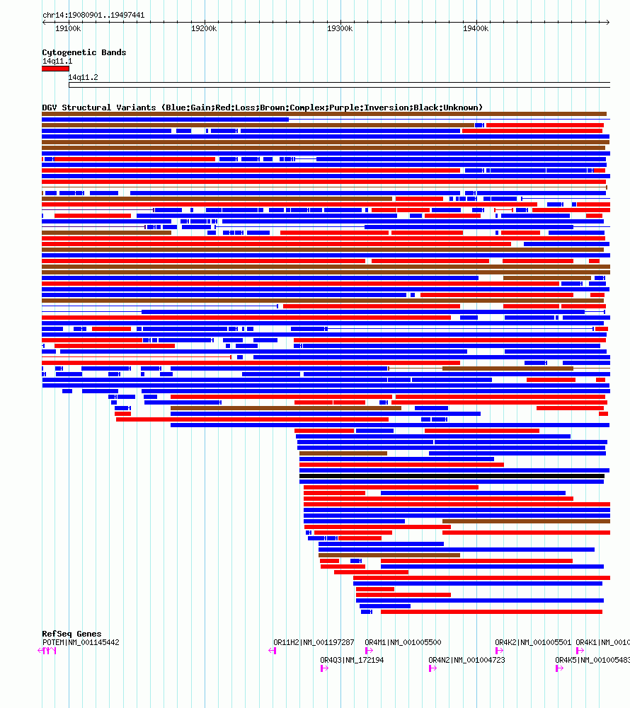 Variant DetailsVariant: dgv1772n100| Internal ID | 22787859 | | Landmark | | | Location Information | | | Cytoband | 14q11.1 | | Allele length | | Assembly | Allele length | | hg38 | 534483 | | hg19 | 416701 | | hg18 | 416541 |