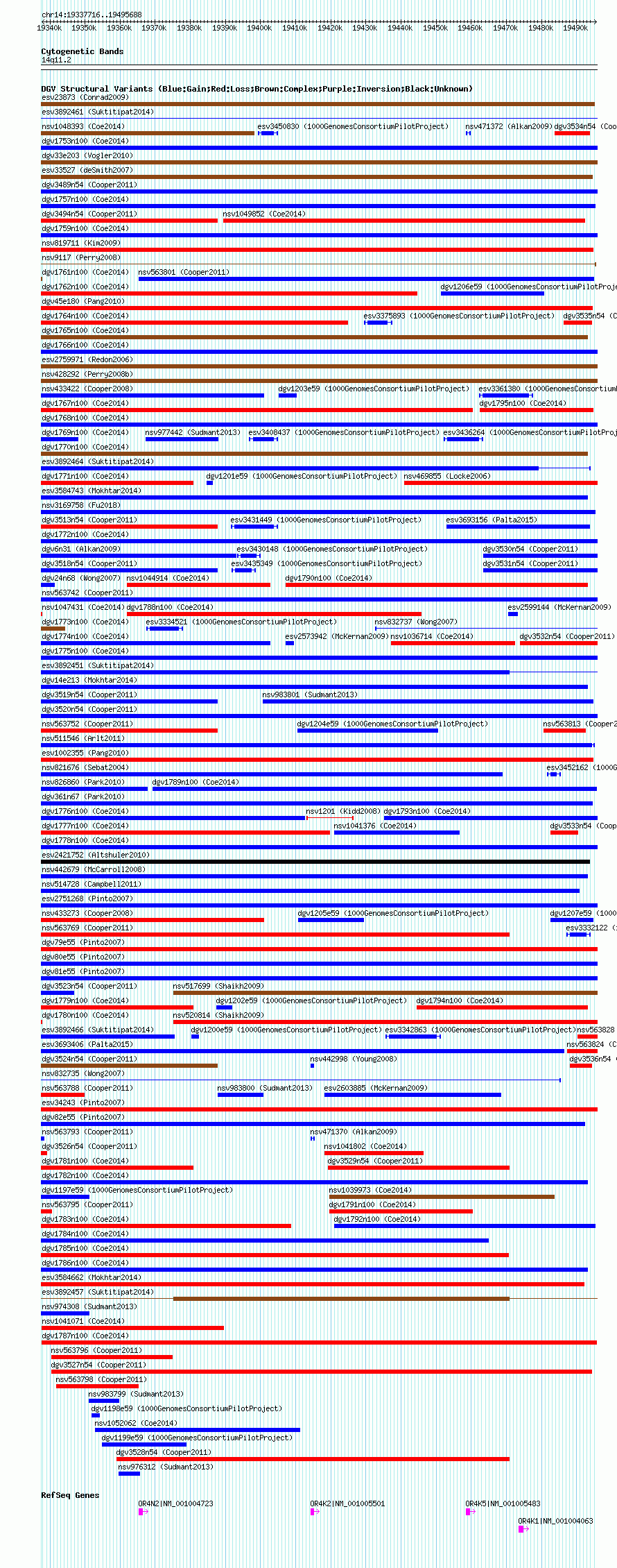 Variant DetailsVariant: dgv1787n100| Internal ID | 22787874 | | Landmark | | | Location Information | | | Cytoband | 14q11.2 | | Allele length | | Assembly | Allele length | | hg38 | 157973 | | hg19 | 157973 | | hg18 | 157973 |