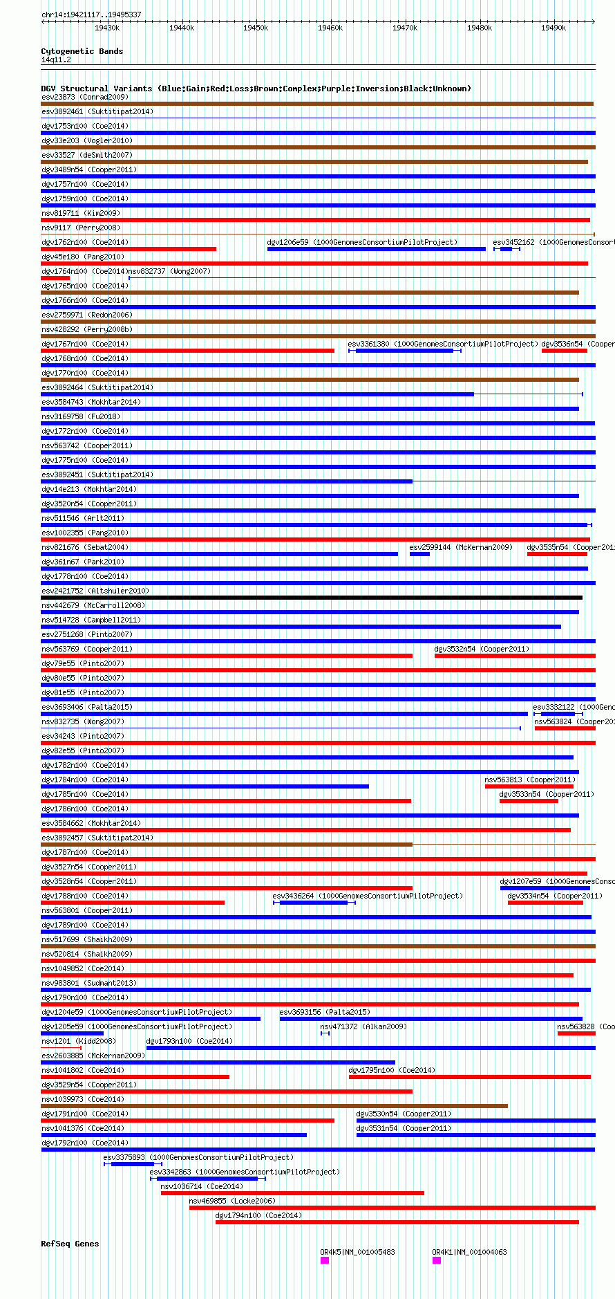 Variant DetailsVariant: dgv1792n100| Internal ID | 22787879 | | Landmark | | | Location Information | | | Cytoband | 14q11.2 | | Allele length | | Assembly | Allele length | | hg38 | 74221 | | hg19 | 74221 | | hg18 | 74221 |