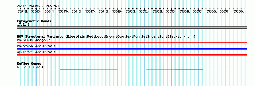 Variant DetailsVariant: dgv179n21| Internal ID | 22766371 | | Landmark | | | Location Information | | | Cytoband | 17q21.1 | | Allele length | | Assembly | Allele length | | hg38 | 16998 | | hg19 | 16998 | | hg18 | 16998 | | hg17 | 16998 |