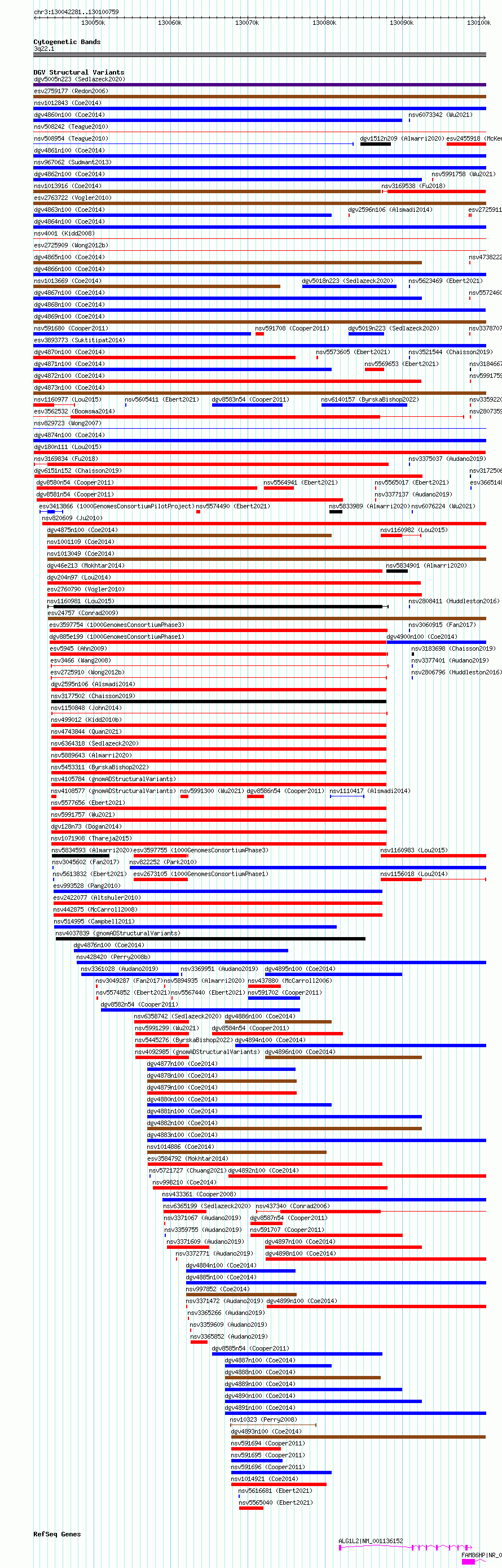 Variant DetailsVariant: dgv180n111| Internal ID | 22798380 | | Landmark | | | Location Information | | | Cytoband | 3q22.1 | | Allele length | | Assembly | Allele length | | hg38 | 58479 | | hg19 | 58479 |