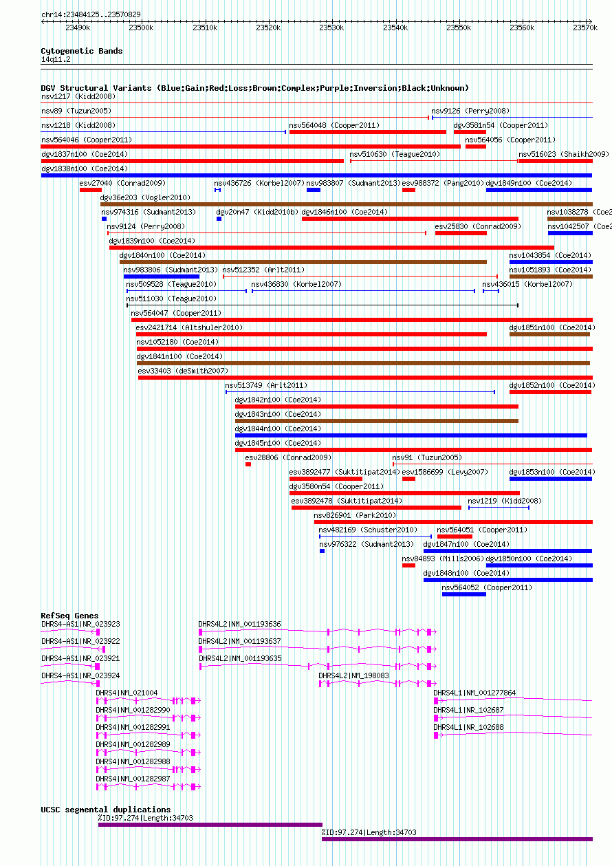 Variant DetailsVariant: dgv1838n100| Internal ID | 20153454 | | Landmark | | | Location Information | | | Cytoband | 14q11.2 | | Allele length | | Assembly | Allele length | | hg38 | 86705 | | hg19 | 86705 | | hg18 | 86705 |