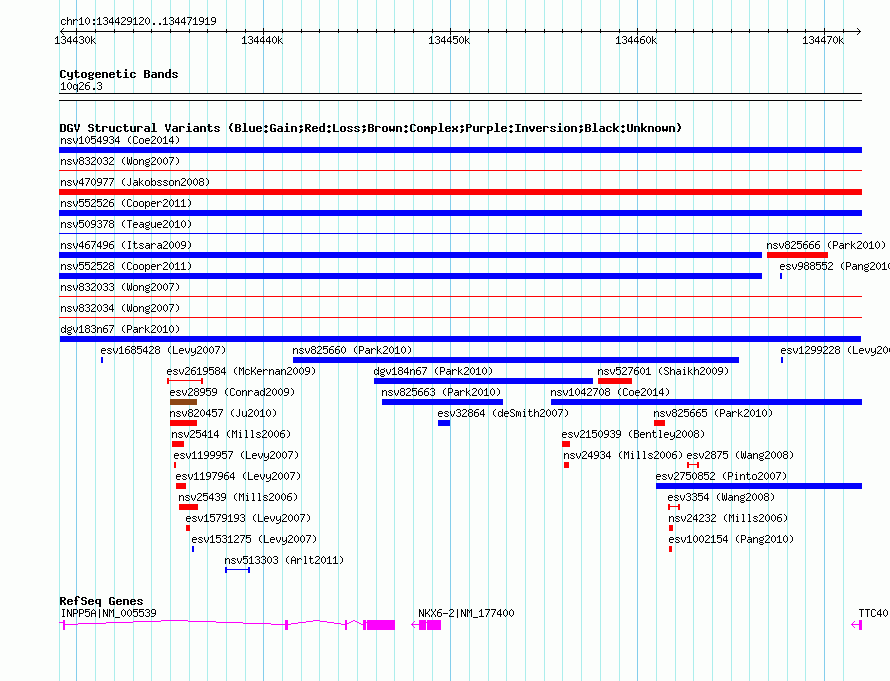 Variant DetailsVariant: dgv183n67 | Internal ID | 20146695 | | Landmark | | | Location Information | | | Cytoband | 10q26.3 | | Allele length | | Assembly | Allele length | | hg38 | 42800 | | hg19 | 42800 | | hg18 | 42800 |