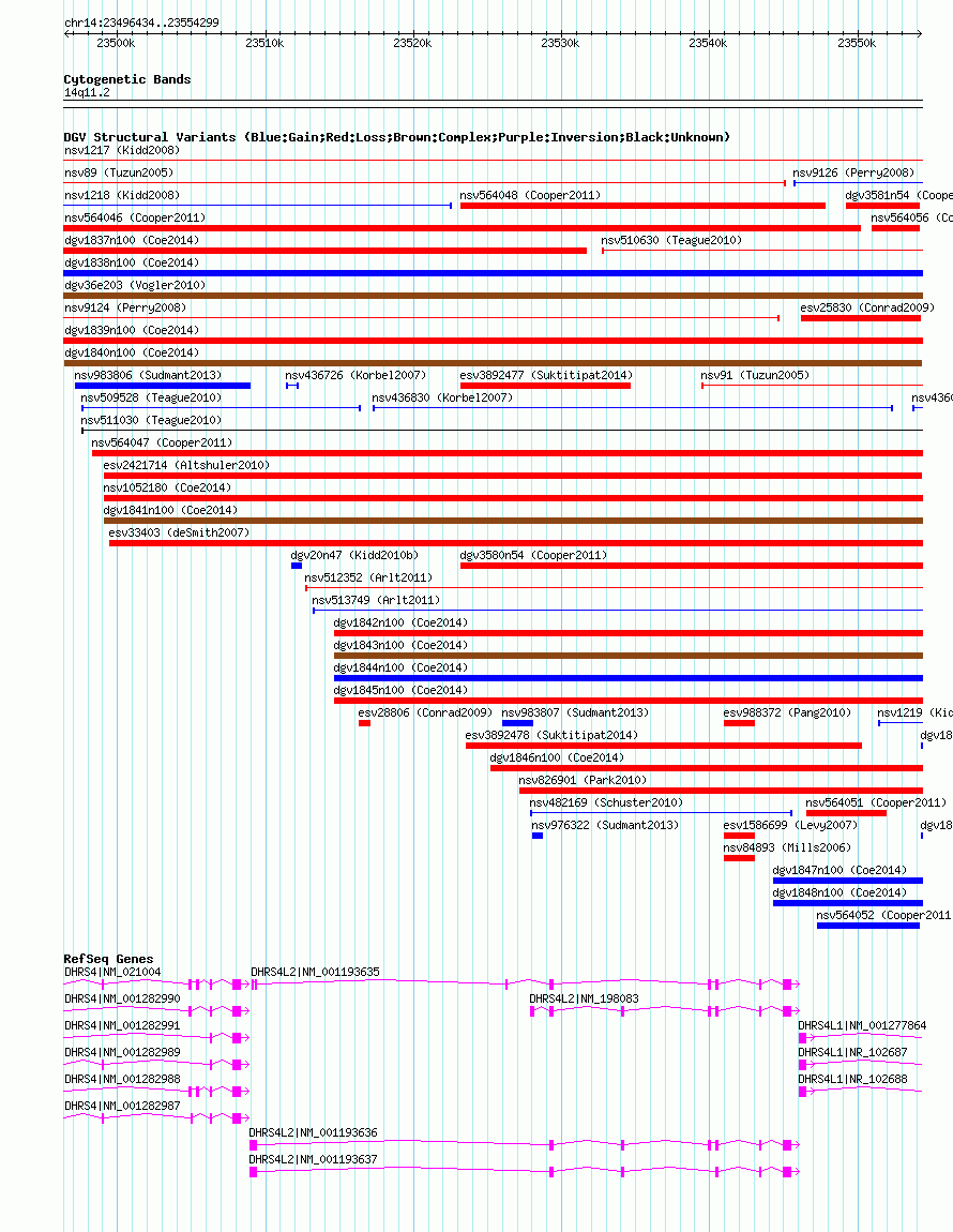 | | Variant Type | CNV gain+loss | | Copy Number | | | Allele State | | | Allele Origin | | | Probe Count | | | Validation Flag | | | Merged Status | M | | Merged Variants | | | Supporting Variants | nsv1039452, nsv1047997 | | Samples | | | Known Genes | DHRS4, DHRS4L1, DHRS4L2 | | Method | SNP array | | Analysis | Affymetrix SNP array copy number analysis | | Platform | Affymetrix SNP Array 6.0 | | Comments | | | Reference | Coe_et_al_2014 | | Pubmed ID | 25217958 | | Accession Number(s) | dgv1840n100