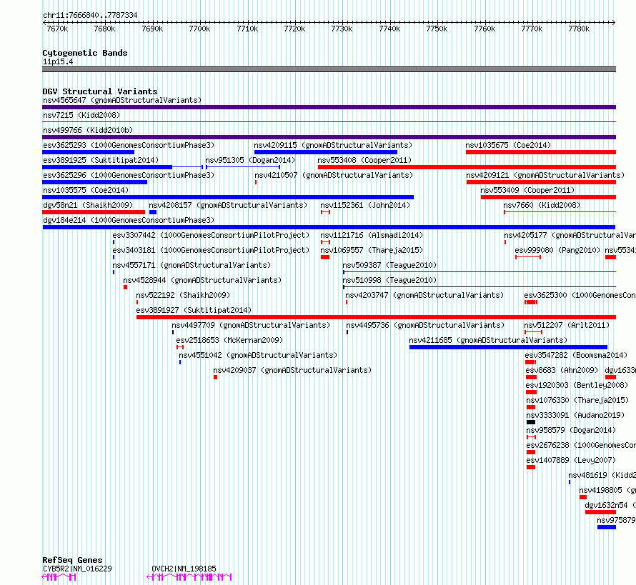 Variant DetailsVariant: dgv184e214| Internal ID | 20121607 | | Landmark | | | Location Information | | | Cytoband | 11p15.4 | | Allele length | | Assembly | Allele length | | hg38 | 120495 | | hg19 | 120811 |