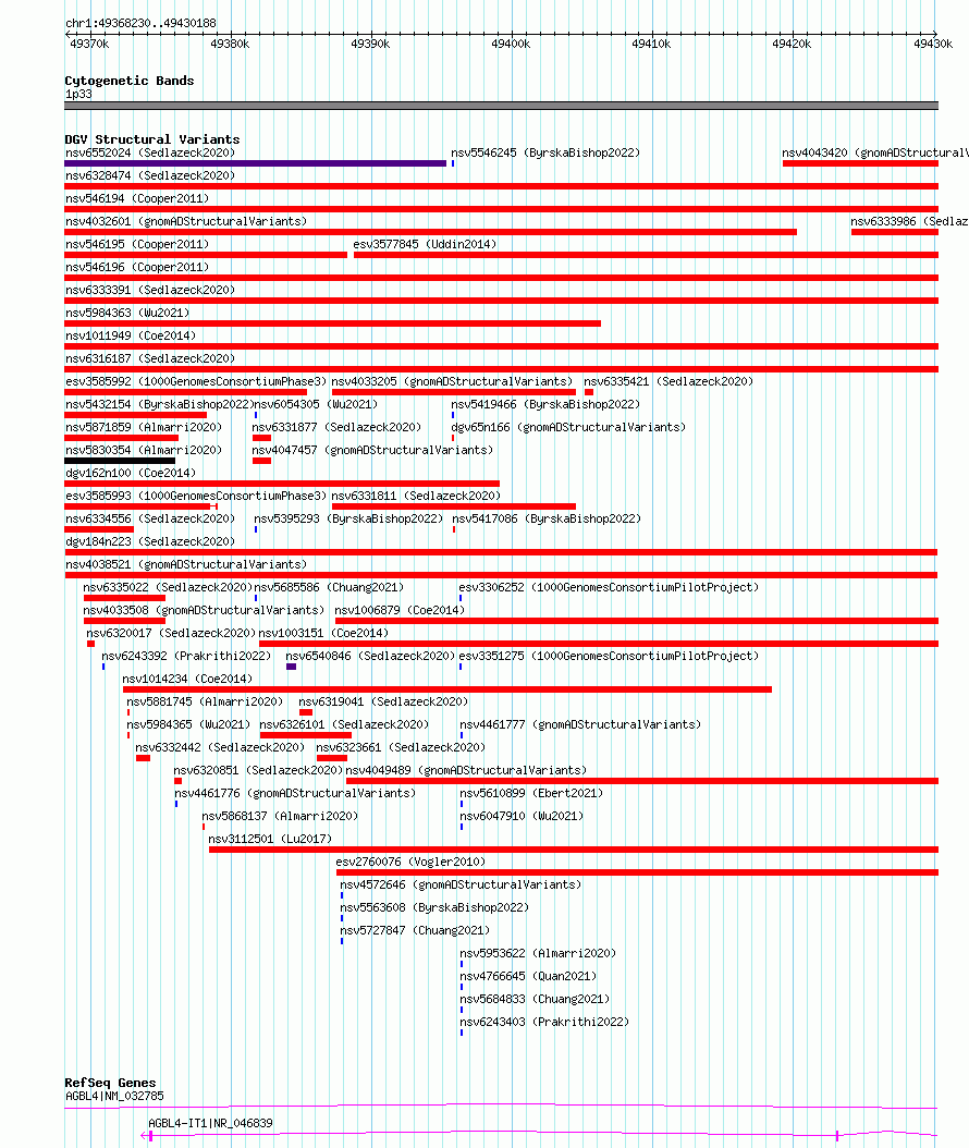 Variant DetailsVariant: dgv184n223| Internal ID | 22803152 | | Landmark | | | Location Information | | | Cytoband | 1p33 | | Allele length | | Assembly | Allele length | | hg38 | 61959 | | hg19 | 61959 |