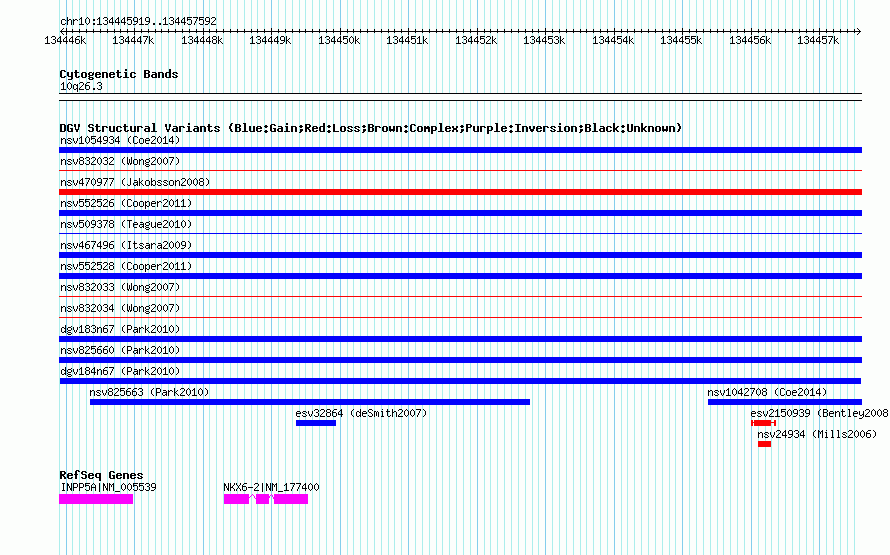 Variant DetailsVariant: dgv184n67 | Internal ID | 20146696 | | Landmark | | | Location Information | | | Cytoband | 10q26.3 | | Allele length | | Assembly | Allele length | | hg38 | 11674 | | hg19 | 11674 | | hg18 | 11674 |