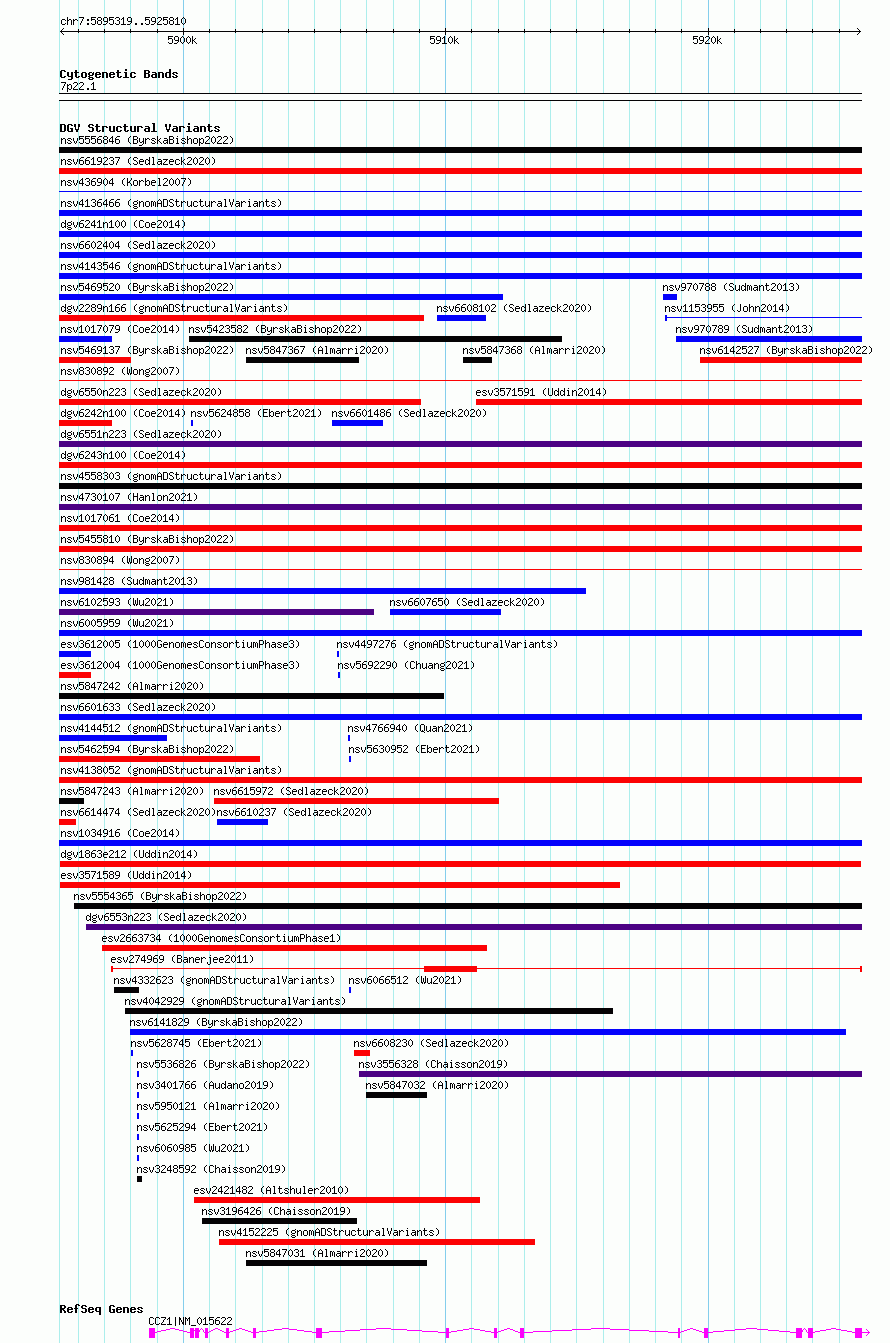 Variant DetailsVariant: dgv1863e212| Internal ID | 22784790 | | Landmark | | | Location Information | | | Cytoband | 7p22.1 | | Allele length | | Assembly | Allele length | | hg38 | 30492 | | hg19 | 30492 |