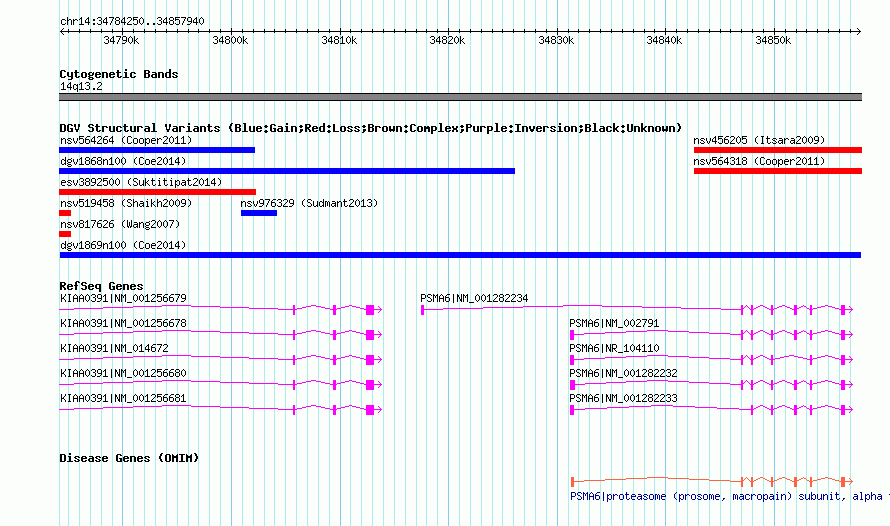 | | Variant Type | CNV gain | | Copy Number | | | Allele State | | | Allele Origin | | | Probe Count | | | Validation Flag | | | Merged Status | M | | Merged Variants | | | Supporting Variants | nsv1045288, nsv1038396 | | Samples | | | Known Genes | KIAA0391, PSMA6 | | Method | SNP array | | Analysis | Affymetrix SNP array copy number analysis | | Platform | Affymetrix SNP Array 6.0 | | Comments | | | Reference | Coe_et_al_2014 | | Pubmed ID | 25217958 | | Accession Number(s) | dgv1869n100