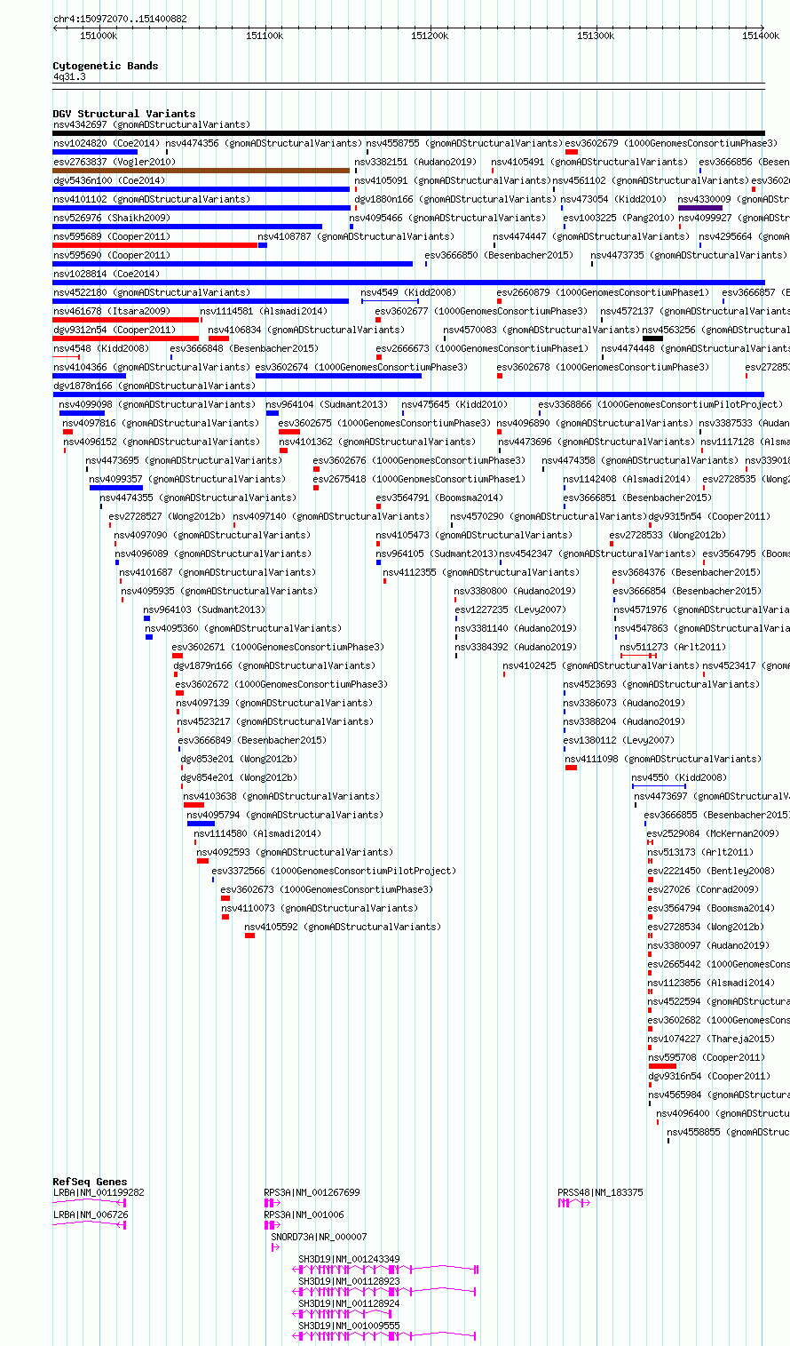 | | Variant Type | CNV duplication | | Copy Number | | | Allele State | | | Allele Origin | | | Probe Count | | | Validation Flag | | | Merged Status | M | | Merged Variants | | | Supporting Variants | nsv4111835, nsv4098111 | | Samples | | | Known Genes | LRBA, PRSS48, RPS3A, SH3D19, SNORD73A | | Method | Sequencing | | Analysis | SV calls were generated using multi-algorithm consensus pipeline involving raw evidence assessment, filtering, clustering, genotyping, alternative allele structure resolution, and gene annotation. These methods are described in detail in the gnomAD-SV preprint [Collins*, Brand*, et al., bioRxiv (2019)|https://www.biorxiv.org/content/10.1101/578674v1], and are largely based on methods developed in [Werling et al., Nat. Genet. (2018)|https://www.ncbi.nlm.nih.gov/pubmed/29700473]. | | Platform | | | Comments | | | Reference | gnomAD_Structural_Variants | | Pubmed ID | 12345678 | | Accession Number(s) | dgv1878n166