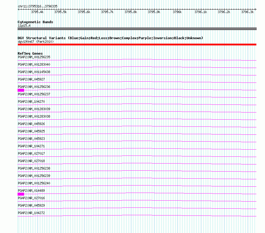 Variant DetailsVariant: dgv190n67 | Internal ID | 20146702 | | Landmark | | | Location Information | | | Cytoband | 11p15.4 | | Allele length | | Assembly | Allele length | | hg38 | 1020 | | hg19 | 1020 | | hg18 | 1020 |