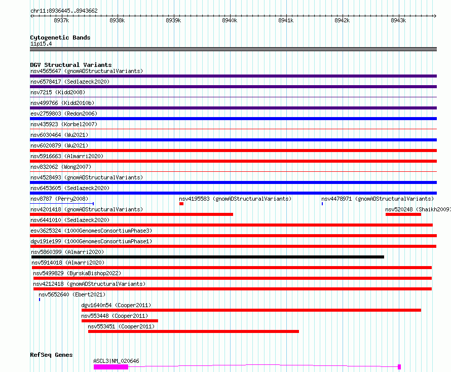 Variant DetailsVariant: dgv191e199| Internal ID | 22757964 | | Landmark | | | Location Information | | | Cytoband | 11p15.4 | | Allele length | | Assembly | Allele length | | hg38 | 7218 | | hg19 | 7218 |