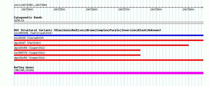 | | Variant Type | CNV loss | | Copy Number | | | Allele State | | | Allele Origin | | | Probe Count | | | Validation Flag | | | Merged Status | M | | Merged Variants | | | Supporting Variants | nsv545779, nsv545780 | | Samples | | | Known Genes | CNR2 | | Method | SNP array | | Analysis | Illumina SNP array copy number analysis | | Platform | Not reported | | Comments | | | Reference | Cooper_et_al_2011 | | Pubmed ID | 21841781 | | Accession Number(s) | dgv191n54