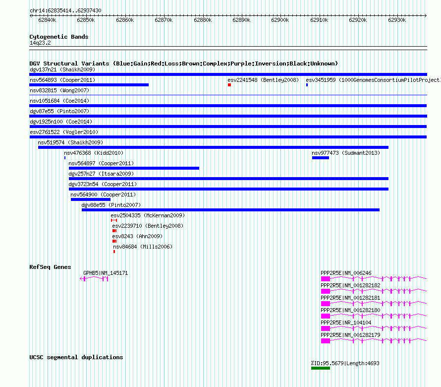 | | Variant Type | CNV gain | | Copy Number | | | Allele State | | | Allele Origin | | | Probe Count | | | Validation Flag | | | Merged Status | M | | Merged Variants | | | Supporting Variants | nsv1053882, nsv1041108, nsv1044094, nsv1049419, nsv1050897, nsv1036375, nsv1039158, nsv1045700, nsv1054848, nsv1049638 | | Samples | | | Known Genes | GPHB5, PPP2R5E | | Method | SNP array | | Analysis | Affymetrix SNP array copy number analysis | | Platform | Affymetrix SNP Array 6.0 | | Comments | | | Reference | Coe_et_al_2014 | | Pubmed ID | 25217958 | | Accession Number(s) | dgv1925n100