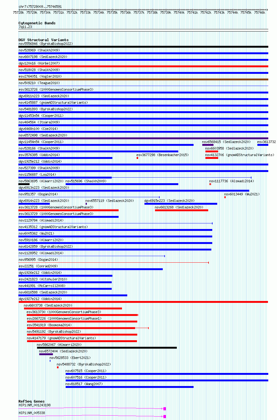 Variant DetailsVariant: dgv1927e212| Internal ID | 22784854 | | Landmark | | | Location Information | | | Cytoband | 7q11.23 | | Allele length | | Assembly | Allele length | | hg38 | 18583 | | hg19 | 18583 |