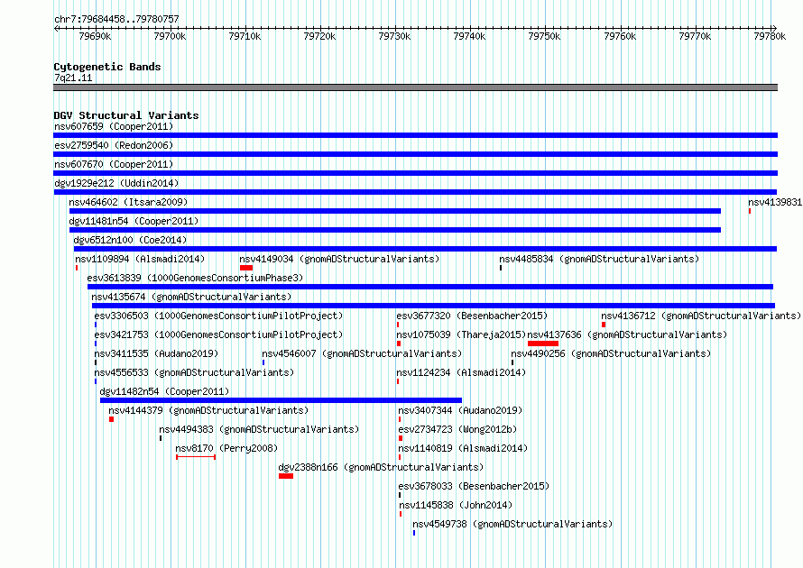 Variant DetailsVariant: dgv1929e212| Internal ID | 20150385 | | Landmark | | | Location Information | | | Cytoband | 7q21.11 | | Allele length | | Assembly | Allele length | | hg38 | 96300 | | hg19 | 96300 |