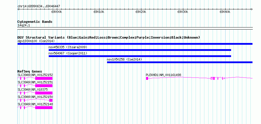 Variant DetailsVariant: dgv1930n100| Internal ID | 22788017 | | Landmark | | | Location Information | | | Cytoband | 14q24.1 | | Allele length | | Assembly | Allele length | | hg38 | 55814 | | hg19 | 55814 | | hg18 | 55814 |