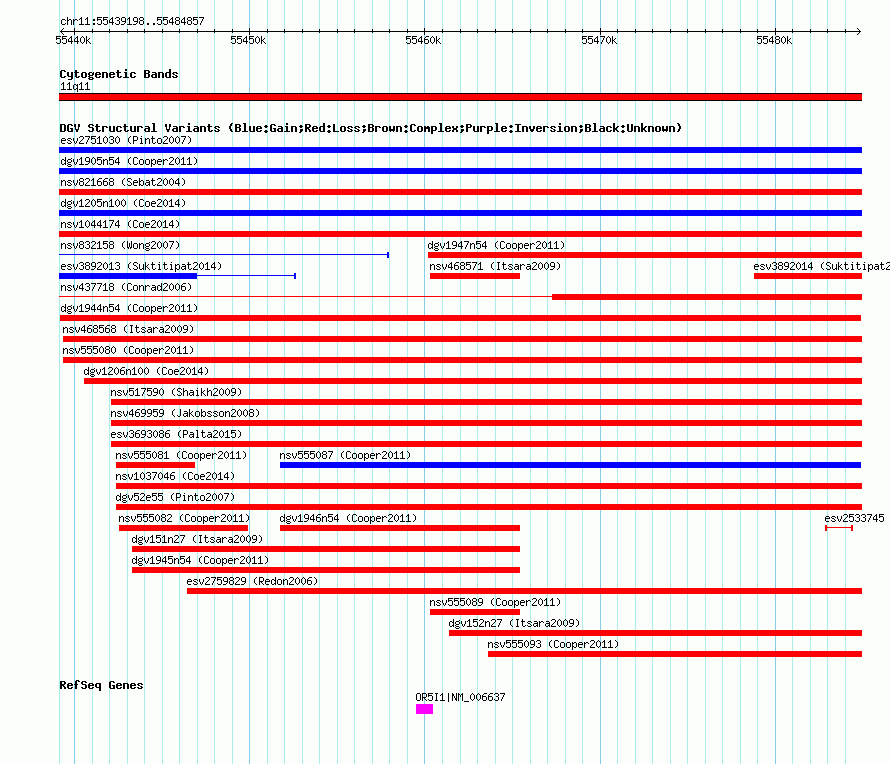 Variant DetailsVariant: dgv1944n54| Internal ID | 22769839 | | Landmark | | | Location Information | | | Cytoband | 11q11 | | Allele length | | Assembly | Allele length | | hg38 | 45660 | | hg19 | 45660 | | hg18 | 45660 |