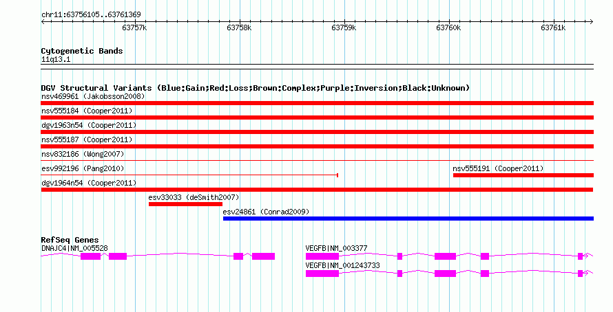 | | Variant Type | CNV loss | | Copy Number | | | Allele State | | | Allele Origin | | | Probe Count | | | Validation Flag | | | Merged Status | M | | Merged Variants | | | Supporting Variants | nsv555188, nsv555189, nsv555190 | | Samples | | | Known Genes | DNAJC4, VEGFB | | Method | SNP array | | Analysis | Illumina SNP array copy number analysis | | Platform | Not reported | | Comments | | | Reference | Cooper_et_al_2011 | | Pubmed ID | 21841781 | | Accession Number(s) | dgv1964n54
