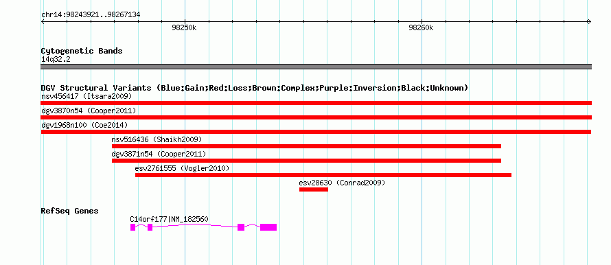 Variant DetailsVariant: dgv1968n100| Internal ID | 22788055 | | Landmark | | | Location Information | | | Cytoband | 14q32.2 | | Allele length | | Assembly | Allele length | | hg38 | 23214 | | hg19 | 23214 | | hg18 | 23214 |