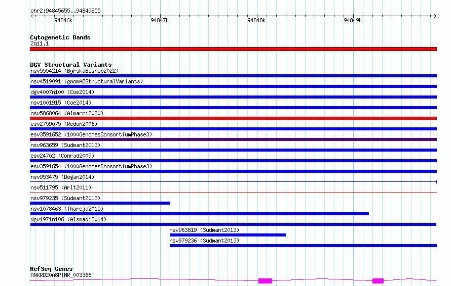 Variant DetailsVariant: dgv1971n106| Internal ID | 22795799 | | Landmark | | | Location Information | | | Cytoband | 2q11.1 | | Allele length | | Assembly | Allele length | | hg38 | 4201 | | hg19 | 4201 |