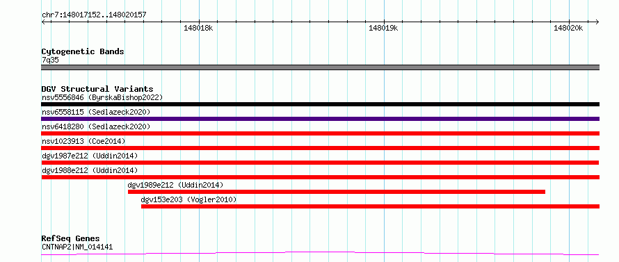 Variant DetailsVariant: dgv1987e212| Internal ID | 22784914 | | Landmark | | | Location Information | | | Cytoband | 7q35 | | Allele length | | Assembly | Allele length | | hg38 | 3006 | | hg19 | 3006 |