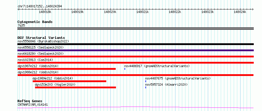 Variant DetailsVariant: dgv1988e212 | Internal ID | 22784915 | | Landmark | | | Location Information | | | Cytoband | 7q35 | | Allele length | | Assembly | Allele length | | hg38 | 7243 | | hg19 | 7243 |