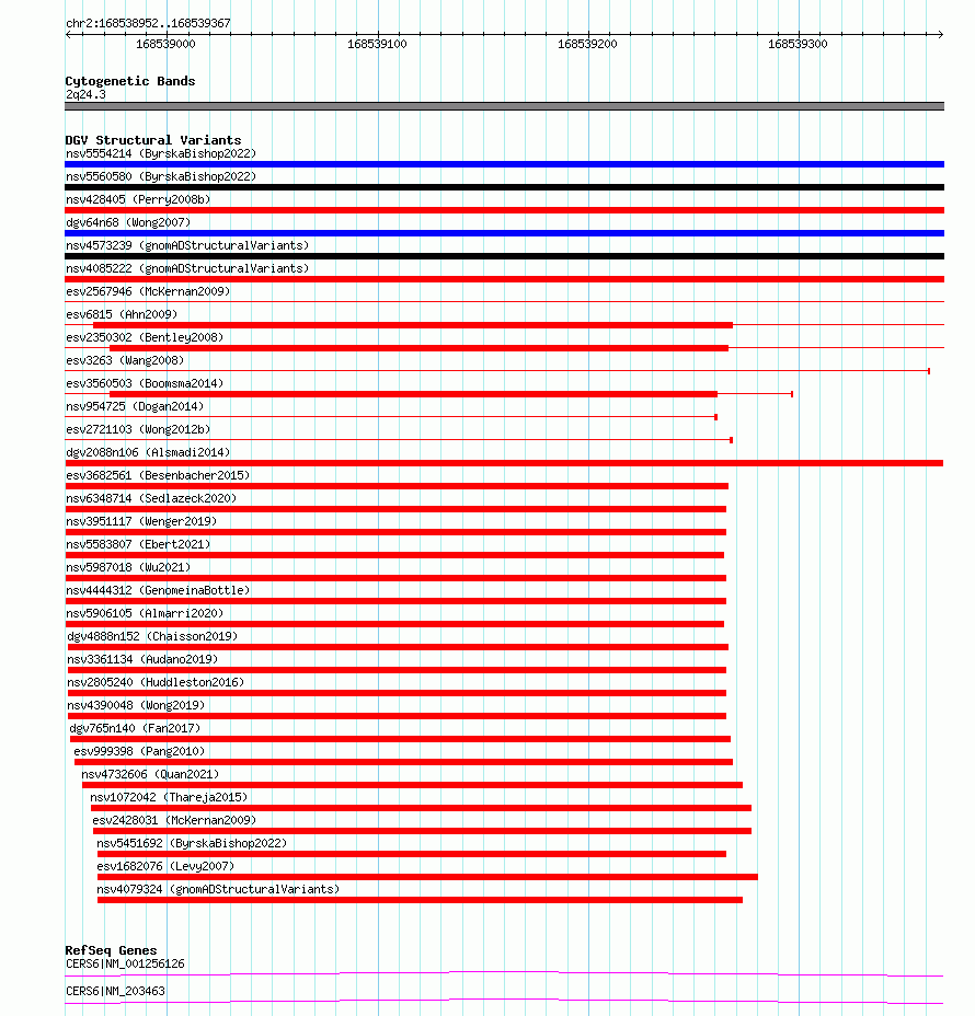 | | Variant Type | CNV deletion | | Copy Number | | | Allele State | | | Allele Origin | | | Probe Count | | | Validation Flag | | | Merged Status | M | | Merged Variants | | | Supporting Variants | nsv1130003, nsv1121222, nsv1119028 | | Samples | KWS2, KWS1 | | Known Genes | CERS6 | | Method | Sequencing | | Analysis | HugeSeq | | Platform | Illumina HiSeq 2000 | | Comments | | | Reference | Alsmadi_et_al_2014 | | Pubmed ID | 24896259 | | Accession Number(s) | dgv2088n106