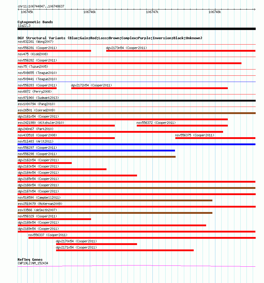 | | Variant Type | CNV loss | | Copy Number | | | Allele State | | | Allele Origin | | | Probe Count | | | Validation Flag | | | Merged Status | M | | Merged Variants | | | Supporting Variants | nsv556348, nsv556340, nsv556333, nsv556341, nsv556342, nsv556356, nsv556334, nsv556349, nsv556346, nsv556351, nsv556336, nsv556355, nsv556347, nsv556331, nsv556332 | | Samples | | | Known Genes | CWF19L2 | | Method | SNP array | | Analysis | Illumina SNP array copy number analysis | | Platform | Not reported | | Comments | | | Reference | Cooper_et_al_2011 | | Pubmed ID | 21841781 | | Accession Number(s) | dgv2169n54
