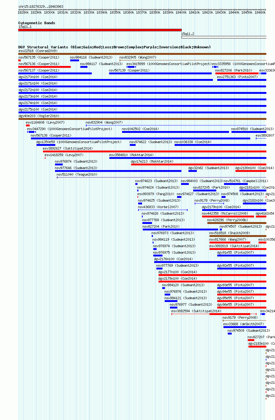 Variant DetailsVariant: dgv2171n100| Internal ID | 22788258 | | Landmark | | | Location Information | | | Cytoband | 15q11.1 | | Allele length | | Assembly | Allele length | | hg38 | 187634 | | hg19 | 187634 | | hg18 | 187635 |