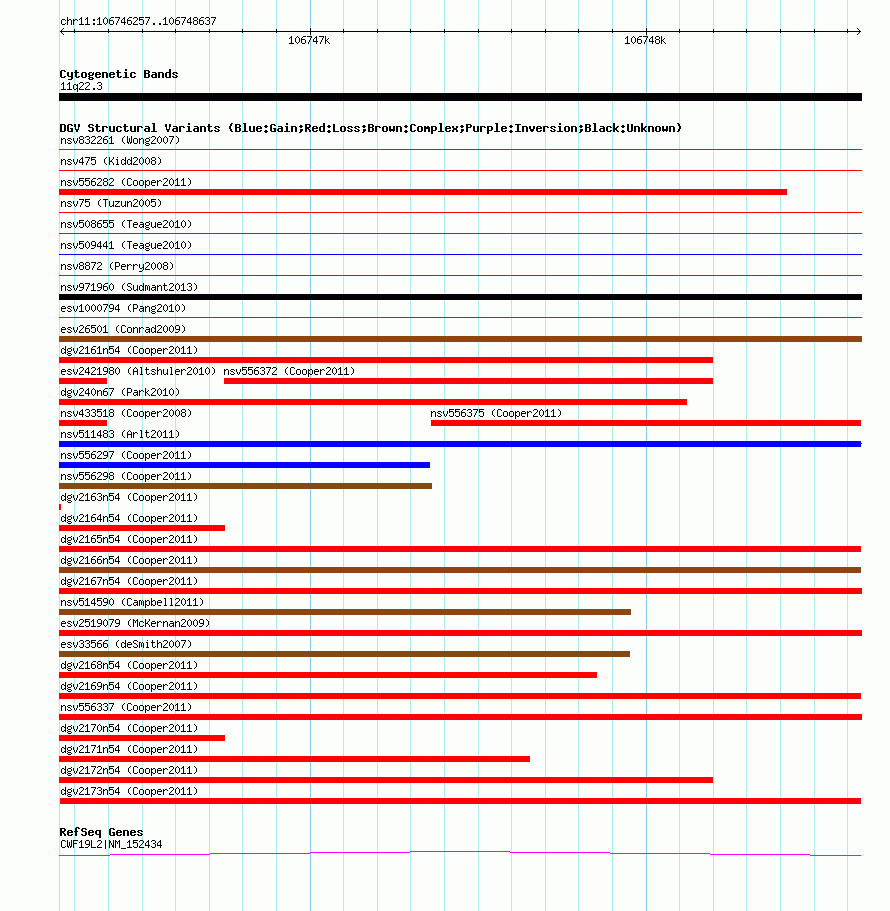 Variant DetailsVariant: dgv2173n54| Internal ID | 22770068 | | Landmark | | | Location Information | | | Cytoband | 11q22.3 | | Allele length | | Assembly | Allele length | | hg38 | 2381 | | hg19 | 2381 | | hg18 | 2381 |