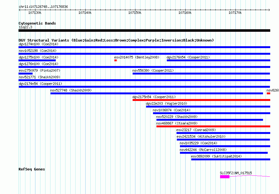 Variant DetailsVariant: dgv2174n54| Internal ID | 22770069 | | Landmark | | | Location Information | | | Cytoband | 11q22.3 | | Allele length | | Assembly | Allele length | | hg38 | 50089 | | hg19 | 50089 | | hg18 | 50089 |