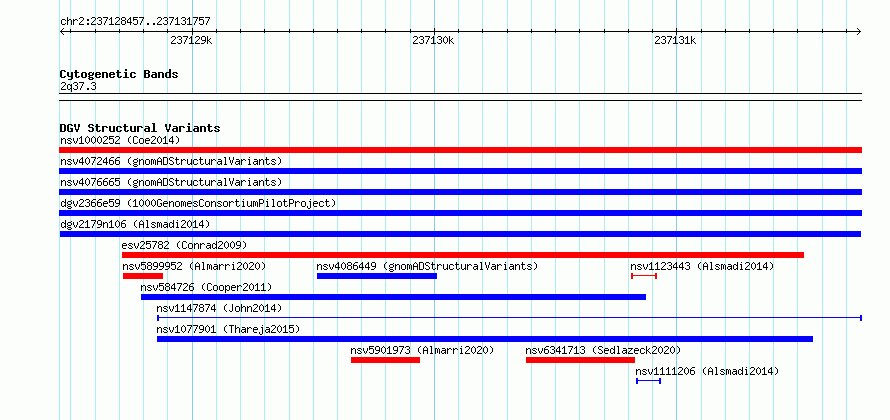 Variant DetailsVariant: dgv2179n106| Internal ID | 22796007 | | Landmark | | | Location Information | | | Cytoband | 2q37.3 | | Allele length | | Assembly | Allele length | | hg38 | 3301 | | hg19 | 3301 |